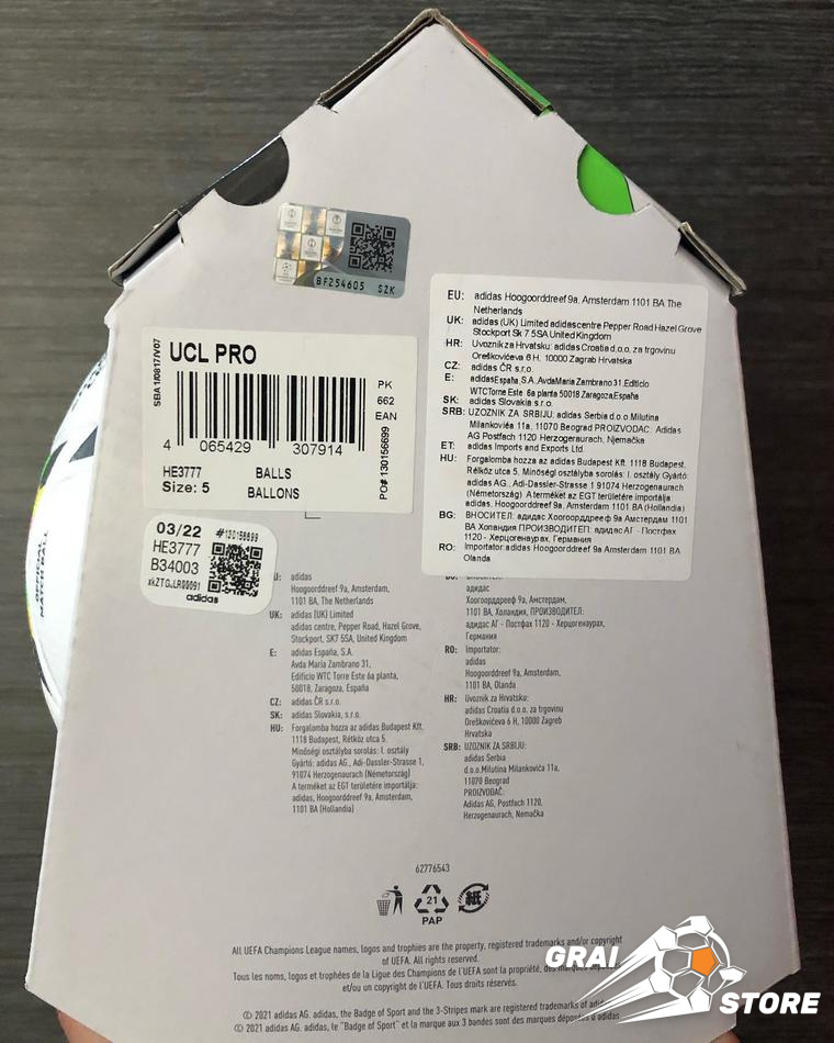 Одобрен FIFA - сертификат FIFA Quality Pro (FIFA Approved), для проведения официальных соревнований высшего уровня. Рекомендуется для профессиональных команд и клубов. Логотип Лиги чемпионов УЕФА.